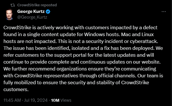 “A few hours into the outage, companies that were taken down realized what had happened and demanded answers from the supplier, so CrowdStrike’s CEO announced that they are investigating the issue.